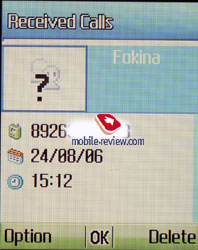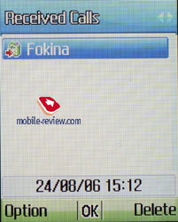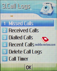 Списки звонков. В каждом из списков находится до 20 записей, все достаточно привычно. Есть объединенный список на 30 номеров. Одинаковые номера не суммируются, а отображаются подряд. Если есть соответствующее изображение, для звонка отображается иконка звонившего. Присутствуют данные о длительности звонка. В этом же меню находятся счетчики звонков, время GPRS-трафика.