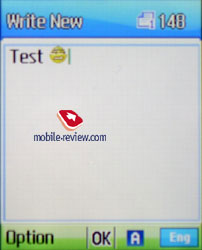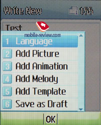 Сообщения. В памяти телефона может храниться до 100 сообщений. Аппарат поддерживает стандарт EMS, вследствие чего в нем есть набор небольших картинок, анимаций, а также мелодий, которые можно добавлять в тело сообщения. Есть возможность создавать собственные шаблоны. Предусмотрена мультирассылка сообщений до 5 абонентов.