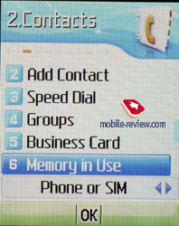 Объем внутренней памяти телефона составляет 19.7 Мб, она динамически распределяется между приложениями. Имеется возможность расширить ее объем с помощью карт памяти формата T-Flash. Телефонная книга. В памяти аппарата может храниться до 800 номеров. Записи могут отображаться как отдельно из памяти аппарата и SIM-карты, так и вместе. На одно имя можно записать до 4 номеров, адрес электронной почты, установить мелодию вызова, присвоить имени фото или видео, которое будет отображаться при входящем звонке, а также занести имя в одну из 10 групп. Пользователь в праве создать свою группу или выбрать одну из 4-х доступных. Каждой группе можно назначить имя (до 19 символов) и сигнал вызова.