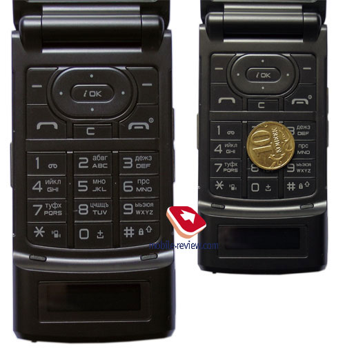 Телефон легко открывается одной рукой, для удобства на правой и левой боковой поверхности имеются довольно большие углубления. Угол открытия составляет практически 180 градусов. У аппарата верхняя часть короче нижней, так как на выступе нижней половины телефона производитель разместил небольшой двухцветный OLED-дисплей. Расположение дисплея не совсем обычно, но, несмотря на это, в пользовании им нет никаких трудностей. В целом проблем с внешним дисплеем и не должно было быть, ведь он расположен на лицевой панели, как и у других аппаратов. Информация на экране читается хорошо при любом освещении. На нем помещается две строки: одна со служебной информацией и одна – с пользовательской. При входящем звонке на дисплее отображается тип соединения и имя звонящего. Непонятно, зачем надо было выводить на внешний дисплей информацию о типе соединения, так как она отображается только во время входящего вызова и абсолютно не нужна. Лучше бы место, которое занимает надпись о типе соединения, отвели для имени или номера абонента. Во время работы MP3-плеера на внешнем экране отображается название текущей композиции, а для режима ожидания можно включить отображение одной из двух предустановленных заставок.