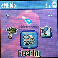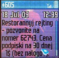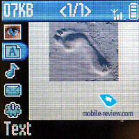 Phonebook supports first letter search, but in order to search again you have to hit at least one name after your first search. This flaw is caused because a name can be searched by entering several letters, for example Smith can be found by 7 (pqrS) or 6 (Mno) and 4 (ghI). A second variant would be more preferable if you have a lot of names in your Phonebook. You can set melodies and pictures (Photo Call) for 20 groups in the Phonebook. Messages. Here you can read incoming messages and compose your own. When you’re listing messages - they will be shown in full-length with the help of a preview line. And when you are selecting a message it will automatically scroll into full-screen mode. It's something new that we don't see everyday, and it's actually quite handy. 10 templates are already composed, which is more or less a standard in a mobile phone these times. You can add one or more funny icons or sounds for EMS messages if you like. ![]()