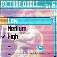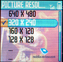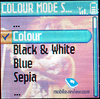 The 530 has a built-in VGA-camera, which supports the 640õ480, 320õ240, 160õ120 and 128õ128 pixels resolutions. The last one is very handy when you’re sending an MMS, considering that the operators very often has a size-limit for each MMS sent, but of course the option to use bigger resolutions is ultimately your prerogative. All pic-files stored in the phone's memory (in JPEG format) are saved to the Picture Folder. When taking pictures you can choose the colour of the picture - colourful or black & white. You can also choose the effects Sepia and Blue, and timer is available as well. ![]()