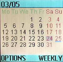 List of keys assigned to commands and list of voice commands are stored in this menu. There is a black-list of phone numbers. This function allows to cut off undesirable phone numbers. Instruments. A calendar in the organizer has weekly and monthly views. Only two kinds of events can be added (reminder and meeting). Each event can be once or repeat several times. Past events can be automatically deleted. Up to 30 messages are stored in the phone memory. The number is not large, but users of this class doubtly need more. ![]()
