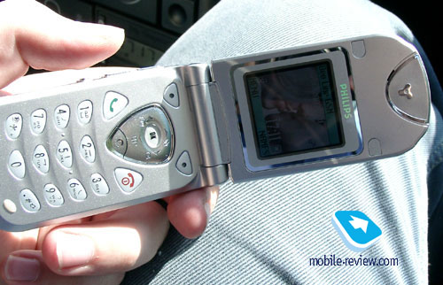 The new handset is a little bit thick. It measures 83 x 43 x 21,8 mm and weighs 78 g, what is comparable to the phones of other manufacturers. You can comfortably wear the phone is the pocket of your jeans, shirt or coat. Holes of the loudspeaker are seen on the external side of the phone. It was done to make polyphonic ringer louder. An external screen has a resolution of 80x49 pixels. One can see analogue or digital clock and date on it in the standby mode.