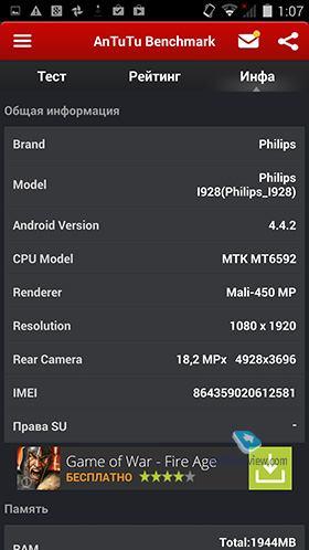Если первое впечатление от работы аккумулятора у меня было среднее, то по прошествии нескольких недель могу сказать, что аппарат зарекомендовал себя неплохо. Это два дня уверенной работы либо полный день с очень большой нагрузкой. Настройки позволяют выкрутить разные параметры так, чтобы продлить время работы. В своем классе эта модель вполне неплоха по этому параметру. Полное время зарядки аккумулятора - около 3.5 часов (зарядка при этом на 100% показывается, через 2.5 часа – в реальности аккумулятор заряжен на 90 процентов). Память, оперативная память, платформаНачну с простого, объем оперативной памяти - 2 ГБ, встроенной - 16 ГБ из них 12.4 ГБ доступны пользователю. Карты памяти почему-то поддерживаются объемом только до 32 ГБ, кто-то может посчитать это серьезным ограничением. Чипсет в этом аппарате от MediaTek – MT6592, 8-ядерный, максимальная тактовая частота - 1.7 ГГЦ. Он довольно давно известен на рынке и используется в десятке разных моделей, достаточно прожорлив с точки зрения энергии. Но при правильных настройках и ограничениях производительности аппарат будет работать довольно долго. И это неплохо, так как даже с такими ограничениями модель оказывается довольно шустрой, вы не почувствуете особых затруднений. Из минусов, которые бросились в глаза, это работа приложений, которые обращаются к сети, например, Play Store. Тут возможно замирание, небыстрая реакция – отключение режима энергосбережения убирает эту проблему. Учитывая, что вы заходите в магазин приложений не постоянно, можно закрыть глаза на эту проблему. Производительность устройства в синтетических тестах вполне типична.