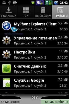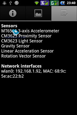 Программная платформа и оболочкаУстройство работает на операционной системе Google Android версии 2.3.5. В тестовом аппарате присутствует версия ПО модуля связи MAUI.11AMD.W11.37.SP.V3 от 2011.10.18, версия ядра – 2.6.35.7. В целом, оформление интерфейса стандартное для Android с рядом оговорок: в нижней части всегда закреплена панель с запуском номеронабирателя, контактов, сообщений и меню. Над панелью уведомлений расположены иконки активации Wi-Fi, Bluetooth, GPS, передачи данных, режима «самолет» и так далее.