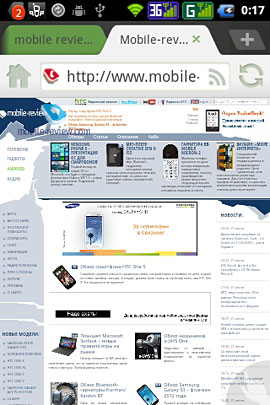 Веб-браузерВ устройстве инсталлированы два приложения для работы с интернет-страницами – стандартный и Dolphin браузеры. Лучше воспользоваться последним, он чуть быстрее, удобнее отображаются вкладки, да и функционально Dolphin Browser побогаче. Поскольку Philips W626 базируется на ARMv6 процессоре, Flash-анимация отсутствует.