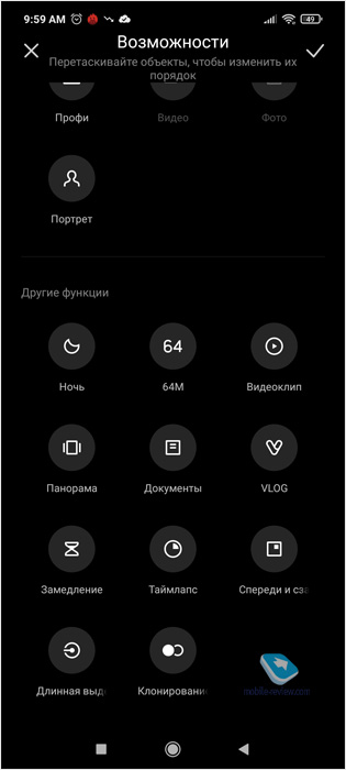 Камера снимает 0.6х, 1х, 2х, но главные богатства скрываются в разделе «Ещё». Там и съёмка сразу на фронтальный и основной фотомодуль, и 64 МП для тех, кому важны все детали, и длинная выдержка, и улучшение текста при фотографировании документов, и функция съёмки видеоблогов (серия коротких видео, как «сторис» в Instagram. И не забудьте заглянуть в раздел «Изменить», он позволит настроить меню фотокамеры на свой вкус, добавив в быстрый доступ режимы, которыми активно пользуетесь.