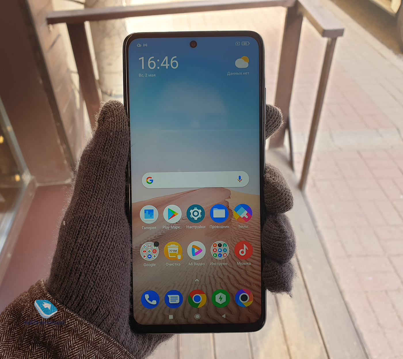 Удивительно, но, несмотря на то, что формально экраны одинаковые, у Poco X3 Pro яркость ниже, чем у Poco X3 NFC, который в автоматическом режиме «выбил» 620 нит. У Poco X3 Pro почему-то всего 520 нит. На ярком солнце экран, конечно, остаётся читаемым, но с лишней сотней нит было бы ещё лучше. Минимальная яркость – 1.9 нита. Это отличный показатель. Учитывая отсутствие мерцания на низкой яркости, режим для чтения и темную тему, можно с комфортом читать в темноте. Читаемость экрана на ярком солнце: