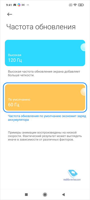 Пользователь в настройках может выбрать частоту обновления экрана – 120 Гц или 60 Гц. Следует пояснить, что в частоте 120 Гц будут работать экраны меню и поддерживаемые приложения. Высокая частота обновления экрана заметна, она добавляет плавности. Но если приложение не поддерживает высокую частоту обновления или, например, вы смотрите видео, то будут стандартные 50-60 Гц. На сайте указано, что в смартфоне есть технология DynamicSwitch с поддержкой частоты обновления экрана 50, 60, 90 и 120 Гц, то есть смартфон сам определяет тип контента и выставляет частоту обновления экрана. Эта функция слегка экономит батарею.