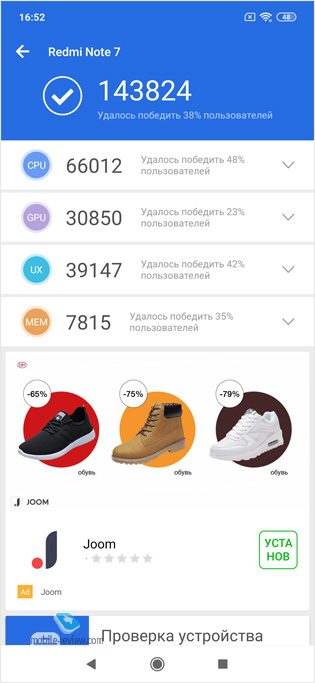 Приятно, что при цене в 14 тысяч в Redmi Note 7 не стали экономить на чипсете и поставили в него SD660, а не SD632, как сделали более крупные производители в более дорогих моделях. Впрочем, признаюсь честно, особой разницы по производительности я не ощутил, за исключением цифр в бенчмарках. Аппарат шустрый, интерфейс работает плавно, скроллинг в приложениях также без подлагиваний. Большинство игр вы сможете запускать на максимальных настройках.
