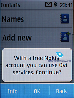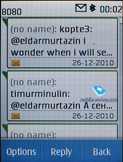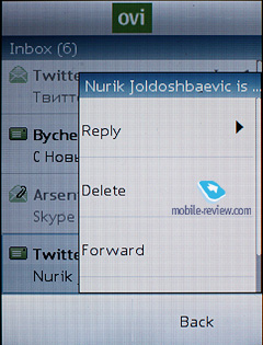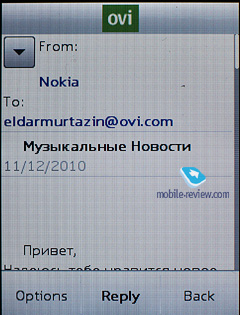 Flash messages - a kind of short message, shows only on the recipient's screen, but not saved into the phone's memory (they can be saved forcibly). While in standby mode, the phone indicates sender's name. Voice Messages – an MMS variation, when you record a voice message, lasting up to 3 minutes 6 seconds (maximum duration), and then send outright. When composing a message the phone number field has text input enabled, so that you have to type in first letters of a contact name and tap the center button to make the handset look for matching entries. Back to the table of contents >>> An e-mail client was considerably redesigned and is based now on OVI service (supported by Yahoo). It handles APOP/POP3/SMTP/IMAP4 protocols. A mail installation wizard can set all required parameters in several steps. If you don't have an e-mail address the phone will offer to get one from OVI.com. It can also find account settings online. It works well for popular mail services and you don't have to put them in manually.
