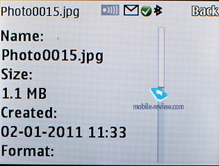 At that, it's important to stress that several applications can be set up in a different way and that's not prohibited. A good example of that is the standard Email client, which retains more settings than the Configurations item does. It's worth repeating that such settings depositary proves to be very fetching. Calls. All phones employ the Voice Clarity technology that enhances call quality in areas with pure reception – in a way, it's an equalizer that negates outside noise. You can also enable in-call timer and after-call note on duration. Software update. This item serves for auto upload of new firmware versions, in other words, it's what they call "over-the-air update". You can opt for scheduled check-ups and also choose the service provider (for some it may be different from Nokia). Back to the table of contents >>> GalleryThe folders with various files are stocked here - all of them have titles matching their contents. You can view the folders as a list, list with labels or as icons. Any multimedia file, including video can be viewed in full-screen (landscape) mode. All data received via Bluetooth is stored in the "Received" folder, and in case the phone cannot provide enough memory, gets redirected to the memory card automatically. There are no caps on the size of received file.