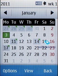 ![]() Back to the table of contents >>> OrganizerUsers can add an unlimited number of entries depending on the amount of available dynamic memory. You can view a calendar for a month, week with hours breakdown together with fast transfer to the entered date. Up to 6 types of events (meeting, call, birthday, anniversary, alert and note) can be added with alerts for every type. Events can be repeated. In the monthly view mode days with events have angled corners. Pressing on a day does not lead you to a list of events. A separate key is required for that.