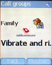 Phone book. Entries from the phone’s memory and SIM-card are displayed at once. Search is present as well. It’s easy to understand weather this entry is stored in the phone’s memory or in the SIM-card since there are icons on the header. All actions related to the entries can be committed after highlighting the Phone book in the menu list, or by choosing one during the listing. The phone supports Groups, there are five of them being preinstalled and you can create new ones as well (the limit is 15). Each group can be awarded with an icon, custom ring tone and alarm type. The settings are nice and easy to get used to. ![]()