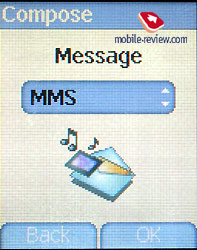 Messages. In phone's memory you can create templates, their quantity which is necessary for you. Besides usual SMS-messages, and also standard EMS, in phone is stipulated MMS support. The function has been checked up in several networks at once and has showed it quite efficient. The opportunity to create the MMS-messages containing some pages (slides), concerns to pluses, similar realization can be met in devices from Sony Ericsson. For fast text input it is possible to use T9 dictionary. ![]()
