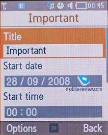ОрганайзерВ памяти телефона можно сохранить до 400 событий, они различны, это встреча, годовщина, праздник, разное, а также личное. Для каждой записи устанавливается время и дата события и указывается время его окончания. Можно выставить сигнал и интервал, за который он сработает, есть повторяемые события (причем настраивается время повтора, указываются исключения, это удобно). Просмотр календаря за месяц и неделю реализован удобно, каждый тип событий имеет свой цвет, все наглядно. К серьезным недостаткам органайзера относится тот факт, что при вводе даты и времени события время окончания остается установленным по умолчанию. У других производителей эти параметры меняются автоматически (по умолчанию дело занимает один час времени). Эргономика органайзера из-за этого серьезно страдает.