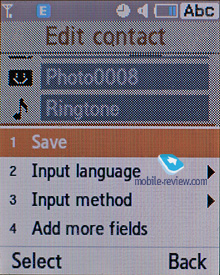 Телефонная книгаВызвать контакты можно по нажатию правой софт-клавиши, перед вами отобразится список, содержащий все записи, как из памяти телефона, так и с SIM-карты. В общем списке фотография абонента отображается, если выбрать имя. Вторая закладка - это переход к группам абонентов. В строке под именем показывается номер по умолчанию, вы можете выбрать его самостоятельно из занесенных в память телефона номеров. Предусмотрен быстрый поиск имени по первым буквам, в этом аппарате их может быть до двадцати, причем для любого языка. Нажав клавишу ОК, вы попадете в меню просмотра отдельной записи, тут отображается небольшая иконка, если изображение соотнесено с именем. В качестве картинки имени может выступать любой графический файл, а также ваши фотографии или видео. Для имени можно записать до 5 номеров телефонов различных типов (мобильный, офисный, домашний, факс, другое), один из них будет основным (по умолчанию – первый введенный). Поля не фиксированы, то есть вы можете выбрать сами их тип. Например, набрать два мобильных номера или указать два домашних.