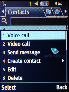 Темы оформления. Изначально установлено 3 темы оформления плюс Living World. Редактор тем позволяет создавать свои темы оформления. Телефонная книгаВызвать контакты можно по нажатию правой софт-клавиши. Перед вами отобразится список, содержащий все записи как из памяти телефона, так и с SIM-карты. В общем списке фотография абонента отображается. В строке под именем показывается номер по умолчанию, вы можете выбрать его самостоятельно из занесенных в память телефона номеров. Предусмотрен быстрый поиск имени и фамилии по первым буквам. В этом аппарате их может быть до двадцати, причем для любого языка. Нажав клавишу ОК, вы попадете в меню просмотра отдельной записи, тут отображается небольшая иконка, если изображение соотнесено с именем. В качестве картинки имени может выступать любой графический файл, а также ваши фотографии или видео. Для имени можно записать до 5 номеров телефонов различных типов (мобильный, офисный, домашний, факс, другое), один из них будет основным (по умолчанию – первый введенный). Поля не фиксированы, вы можете выбирать любой тип телефона для любого номера. В телефоне два поля для имени и фамилии (поиск по обоим полям), при отображении поля суммируются, первым идет поле Имя. Причем суммирующее поле создали в явном виде. К примеру, Эльдар Муртазин показывается именно в такой последовательности. Длина каждого поля равна 20 символам, причем для любого из поддерживаемых языков ввода. Вы можете также чередовать различные языки при наборе имени.