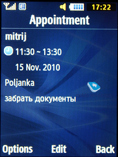 ОрганайзерВ памяти телефона можно сохранить до 500 событий, они различны - встреча, годовщина. Для каждой записи устанавливается время и дата события и указывается время его окончания. Можно выставить сигнал и интервал, за который он сработает, есть повторяемые события (причем настраивается время повтора, указываются исключения, это удобно). Просмотр календаря за месяц и неделю реализован удобно, каждый тип событий имеет свой цвет, все наглядно.