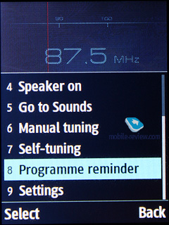 FM-радиоВ памяти аппарата можно сохранить до 99 радиостанций, диапазон доступных частот – от 87.5 МГц до 108 МГц. Есть автоматическая настройка всех станций, но для отдельных каналов нельзя назначить свое имя, они всегда отображаются в виде частоты, цифр. Радио работает и в режиме громкой связи. Реализация радио нормальна, не все радиостанции аппарат принимает хорошо, но в целом все на нормальном уровне, сравнимо с телефонами других производителей. Радио работает в фоновом режиме. Функция RDS показывает только заголовок радиостанции в общем списке вверху, других назначений у данной опции нет. Можно записывать радио на карту памяти или в память телефона. Есть напоминание для прослушивания радио, можно выставить его на определенное время.