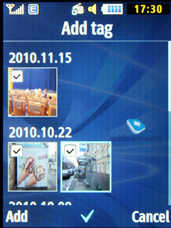 МР3-плеерВ телефоне есть встроенный mp3-плеер, он поддерживает случайное, последовательное и циклическое воспроизведение треков. Загрузить mp3-файлы в телефон можно как напрямую через Bluetooth, так и из программы синхронизации. Файлы могут иметь любые имена и теги, в том числе и на русском языке, телефон хорошо их понимает. Битрейт файлов также не играет большой роли, аппарат прекрасно понимает все доступные форматы. Также поддерживаются файлы WMA, AAC, eAAC, eAAC+. Во время проигрывания показывается номер текущей песни, общее число композиций. Эквалайзер не настраиваемый, всего 9 вариантов эквалайзеров, в том числе автоматический, который подстраивается под проигрываемую композицию. Появилась опция Fade Out, звук в конце композиции затухает. Проигрывание может идти как через стереогарнитуру (в том числе беспроводную), так и через громкую связь. Громкость имеет 14 градаций. Пользователь может создавать свои плей-листы. Плеер работает и в фоновом режиме. В этом случае на экране отображается название композиции и подсказка к управляющим элементам, что приятно. Визуализация представлена либо Album Art, либо анимацией в виде эквалайзера. Фильтр в плеере сделан по всем композициям, по недавно проигранным, наиболее часто используемым, исполнителям, альбомам, жанрам, композиторам. Поддерживается Album Arts. Есть возможность установить автоматическое отключение плеера через заданный интервал времени.