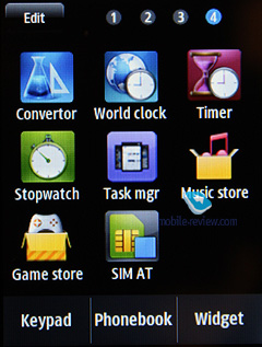 В текущей модели их почти два десятка, есть менеджер, который позволяет загружать новые Widget’ы с сайта Samsung. Вы видите их название, описание, размер. Ни один из производителей не имеет ничего подобного для экрана ожидания. Это - наиболее гибкое решение, которое крайне привлекательно. Всего виджеты можно располагать на трех экранах, листанием осуществляется переход между ними. Предустановленные обои можно устанавливать сразу на три экрана, что также удобно. В главное меню можно попасть, нажав на иконку в нижней части экрана. Главное меню представлено матрицей 3х4. Работа с сенсорным экраном проста. Вы нажимаете на нужный вам пункт, и он оказывается выбранным. Поле для ввода информации – двойное нажатие, первым выбираете поле, вторым вызываете клавиатуру.