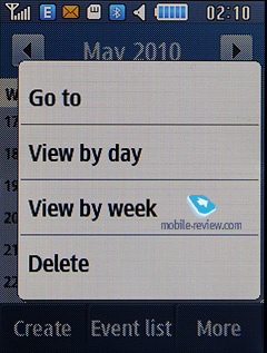 ![]() ОрганайзерВ памяти телефона можно сохранить до 300 событий, это несколько типов событий – расписание (200 записей) и годовщина (100 записей). Для каждой записи устанавливается время и дата события, и указывается время его окончания. Можно выставить сигнал и интервал, за который он сработает, есть повторяемые события (причем настраивается время повтора, указываются исключения - это удобно). Просмотр календаря за месяц и неделю реализован удобно, каждый тип событий имеет свой цвет, все наглядно. К сожалению, нельзя сразу вносить событие, нажав на определенный день в календаре. Нет отображения списка из трех дел для выбранного дня при просмотре месяца - не хватило диагонали экрана.