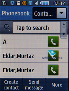 Ввод информации осуществляется с экранной клавиатуры, которая максимально похожа на обычную клавиатуру телефонов. Изображены кнопки, на каждой нанесено несколько символов. Чтобы выбрать нужную букву, вам приходится несколько раз нажимать на клавишу. Экранной QWERTY-клавиатуры нет. Присутствует режим предиктивного ввода текста Т9. На клавиатуре этот режим включается в одно касание. Телефон предлагает различные варианты слов, угадывает их, что позволяет выбрать их из списка в одно касание. Во всех меню присутствует нижняя линейка, в ней клавиши сделаны контекстными, то есть их значение и количество (максимум три) меняются в зависимости от текущего меню. Телефонная книгаВызвать контакты можно из линейки быстрого запуска в нижней части экрана. Перед вами отобразится список, содержащий все записи, как из памяти телефона, так и с SIM-карты. Слева располагается ярлык с изображением лупы - это быстрая прокрутка списка на нужную вам букву. Из выпадающего списка можно выбрать контакты, группы или избранное. Список отображается только именами, справа от них - значок звонка или сообщения (как правило, выбирается номер по умолчанию). Просмотр фотографии в общем списке невозможен, также как и номера. Для этого необходимо выбрать контакт и уже изнутри выбрать номер. В качестве картинки имени может выступать любой графический файл, а также ваши фотографии или видео. Для имени можно записать до 5 номеров телефонов различных типов (мобильный, офисный, домашний, факс, другое), один из них будет основным (по умолчанию – первый введенный). Поля не фиксированы. Из меню телефона можно ввести дополнительные поля, например, адрес электронной почты, обычный адрес и так далее. В телефоне - два поля для имени и фамилии (поиск только по первому полю), при отображении поля суммируются, первым идет поле Имя. Причем суммирующее поле создали в явном виде. К примеру, Эльдар Муртазин показывается именно в такой последовательности. Длина каждого поля равна 20 символам, причем для любого из поддерживаемых языков ввода. Вы можете также чередовать различные языки при наборе имени.