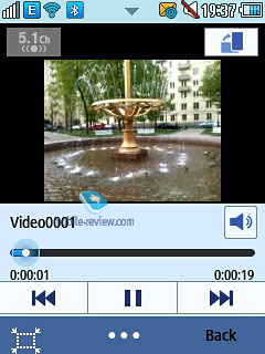 ![]() Проигрыватель видеоОбычный проигрыватель, можно перескочить в другое место файла, потянув ползунок проигрывания, поддерживается DNSe. К сожалению, телефон слабенький, поэтому может проигрывать только видео в разрешении 240х400 точек, большее он не поддерживает. Из поддерживаемых кодеков только стандартные H.263, H.264 (3GP, mp4).