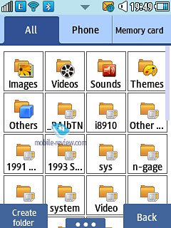 ![]() File Manager (My files)Собственно, здесь собраны все файлы: музыка, картинки, видео, звуки. Все загружаемые файлы попадают сюда. Из недостатков стоит отметить, что иногда файл отображается в общем списке не сразу, требуется выйти и снова открыть список. Поддерживается отображение файлов как в виде списка, так и в виде иконок. Можно выбирать как один, так и несколько файлов из списка. Поддерживаются такие файловые операции, как копирование, удаление, перенос файлов (память телефона, карта памяти). Сортировка файлов может происходить как по времени, так и по типу, имени, размеру. В общем списке по умолчанию отображаются файлы из обоих типов памяти.