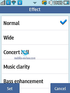 Он поддерживает случайное, последовательное и циклическое воспроизведение треков. Загрузить mp3-файлы в телефон можно как напрямую через Bluetooth, так и из программы синхронизации или Windows Media Player. Файлы могут иметь любые имена и теги, в том числе и на русском языке, телефон хорошо их понимает. Битрейт файлов также не играет большой роли, аппарат прекрасно понимает все доступные форматы. Также поддерживаются файлы WMA, AAC, eAAC, eAAC+. Во время проигрывания показывается номер текущей песни, общее число композиций. Эквалайзер есть, но нет никакой возможности для его настройки. Проигрывание может идти как через стереогарнитуру, так и через громкую связь. Громкость имеет 14 градаций. Пользователь может создавать свои плей-листы. Плеер работает и в фоновом режиме. В этом случае на экране отображается название композиции и подсказка к управляющим элементам, что приятно. В режиме ожидания при свернутом плеере отображаются элементы его управления и название текущей композиции. В режиме громкой связи динамик играет не очень чисто - не хватает мощности, но звук при этом громкий, телефон хорошо слышно.