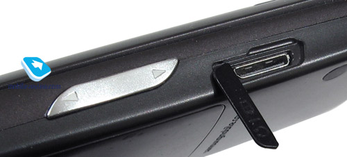 На левом ребре находится клавиша-качелька регулировки громкости. В режиме разговора она изменяет соответствующую громкость, в режиме ожидания – громкость звукового оформления клавиш и открытия слайдера. Здесь же, немного ниже, расположен единственный в телефоне разъем. Он используется для подключения зарядного устройства и гарнитуры. Разъем прикрыт пластиковой заглушкой. Заглушка сделана из плотного прорезиненного материала, при открытии она просто откидывается или отворачивается, ее невозможно потерять. Однако заглушка очень тонкая, это приводит к тому, что в закрытом состоянии вы можете просто утопить ее в корпус, она прогибается. Разглядеть это с расстояния невозможно, это незначительный недостаток или даже просто особенность конструкции. На правом ребре, в его верхней части, находится кнопка активации камеры. Включение фотокамеры происходит длительным нажатием на эту кнопку, съемка – однократным. Других функций она не выполняет.
