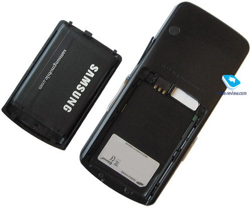 Задняя часть состоит из крышки, которая занимает примерно две трети площади, и разъема для подключения внешней антенны, прикрытого резиновой заглушкой в форме пробки. Крышка крепится пазами. Крепление надежно, если намеренно не расшатывать крышку, заметить люфт невозможно, он минимален даже после многократно повторенного процесса открытия и закрытия крышки. Сняв этот элемент, мы обнаруживаем Li-Ion аккумулятор емкостью 850 мАч. В условиях московской сети Мегафон при 20-30 минутах разговоров в день и только аппарат работает примерно 3-4 дня. Если использовать другие функции (Интернет, игры) в течение часа и столько же времени в день прослушивать MP3-плеер, время работы падает до 2 дней.
