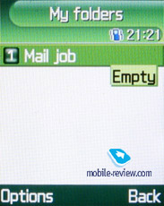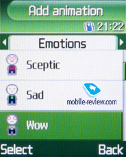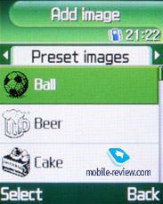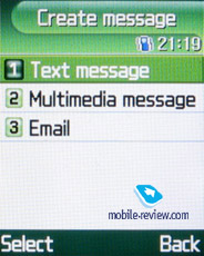 Сообщения. Поддерживаются SMS-, EMS-, MMS-сообщения, а также E-Mail. В памяти аппарата сохраняется до 200 сообщений, также доступна память SIM-карты. Для EMS-сообщений есть набор приятных картинок, анимаций, а также смайлов (emotions) и мелодий. Поддерживается создание объединенных сообщений. Во время ввода текста можно сменить язык или включить словарь T9, это удобно, не нужно для этого каждый раз заходить в меню. Работа с MMS-сообщениями сделана очень просто. При создании нового MMS-сообщения вам сразу предлагается вставить туда картинку, видеофрагмент, мелодию или текст. Можно создавать несколько страниц (слайдов). Объем такого сообщения ограничен 295 Кб. Для MMS-сообщений выделено 3 Мб памяти, из них примерно 200 Кб занято шаблонами. Всего в аппарате присутствует пять шаблонов, они предельно простые.