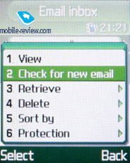 Встроенный почтовый клиент не имеет гибких настроек, однако назвать его простой фикцией также нельзя. Можно создать до пяти аккаунтов. Поддерживается прием заголовков, ограничение на объем принимаемых данных. Также есть возможность автопроверки почты с указанным промежутком времени. Помимо этого, доступна фильтрация, сортировка писем и их перенос в определенные папки, созданные вами. Для хранения почтовых сообщений выделено 3 Мб памяти.