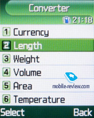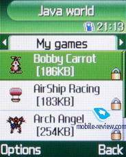 Приложения. Здесь находятся разнообразные дополнительные приложения и программы. Java World. Телефон поддерживает Java MIDP 2.0, под Java-приложения отведено 4 Мб памяти. Загрузка Java происходит только через WAP. В аппарате предустановлено четыре игры – «Bobby Carrot», «Airship Racing», «Arch Angel» и «Freekick». «Bobby Carrot» – детская аркада в изометрической проекции, где нужно бегать зайцем по огородам и, избегая ловушек, собирать морковку. Если во время игры резко выйти из нее, заяц погибает у вас на глазах. «Airship Racing» – не менее детская аркада. Под вашим управлением оказывается дирижабль, главной целью которого является сбор призовых звезд и фруктов, а также уклонение от назойливых врагов-птиц. «Arch Angel» – вы управляете летательным аппаратом и должны сбивать преследующие вас цели. Между уровнями игра снабжает вас полноценными брифингами с описанием текущих задач. «Freekick» – игра позволяет вам ощутить на себе тяжелые будни футболиста, пробивающего пенальти и штрафные удары днем и ночью. Игры приятные, они способны занять вас в течение небольшого промежутка времени.