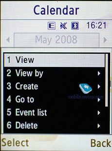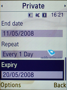 ![]() ОрганайзерВ памяти телефона можно сохранить до 1000 событий, тип событий – встреча, годовщина, разное, задача. Для каждой записи кроме задач устанавливается время и дата события и указывается время его окончания. Можно выставить сигнал и интервал, за который он сработает, есть повторяемые события (причем настраивается время повтора, указываются исключения, это удобно). Просмотр календаря за месяц и неделю реализован удобно, каждый тип событий имеет свой цвет, все наглядно. К серьезным недостаткам органайзера относится тот факт, что при вводе даты и времени события время окончания остается установленным по умолчанию. У других производителей эти параметры меняются автоматически (по умолчанию дело занимает один час времени). Эргономика органайзера из-за этого серьезно страдает.