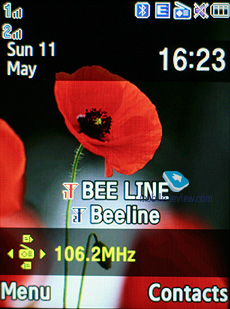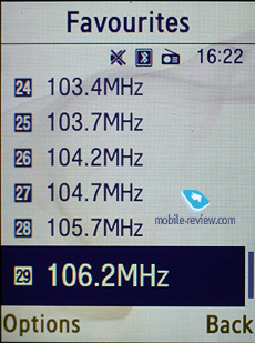 ![]() FM-радиоВ памяти аппарата можно сохранить до 20 радиостанций, диапазон доступных частот – от 87.5 МГц до 108 МГц. Есть автоматическая настройка всех станций, но для отдельных каналов нельзя назначить свое имя, они всегда отображаются в виде частоты, цифр. Радио работает и в режиме громкой связи. Реализация радио нормальна, не все радиостанции аппарат принимает хорошо, но в целом все на нормальном уровне, сравнимо с телефонами других производителей. Радио работает в фоновом режиме. Функция RDS показывает только заголовок радиостанции в общем списке вверху, других назначений у данной опции нет.