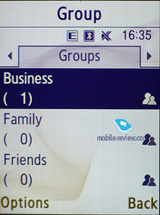 В памяти телефона сохраняется до 1000 имен со всеми заполненными номерами и данными. Если заполнять не все поля, то число имен все равно останется равным тысяче. В настройках можно указать, куда по умолчанию будут записываться все новые номера. Есть настройка переноса записей из памяти SIM-карты и обратно. Разработчики посчитали, что наилучшим способом для синхронизации является ПК, в частности, использование MS Outlook. Любую запись можно быстро отправить на другое устройство как SMS/MMS, почтовое сообщение, а также через Bluetooth. Никаких трудностей с отправкой не возникает, запись телефонной книги уходит на другое устройство без проблем и точно так же распознается. В телефоне можно завести свою визитку, ее формат совпадает полностью с обычной записью телефонной книги. В списке быстрого набора может быть до 8 номеров, причем занести можно и отдельные номера одного имени. На кнопках появляется подпись в виде выбранного имени, но не типа телефона.