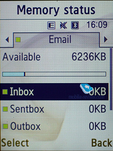 Встроенный почтовый клиент обычен, никаких особенностей у него нет. Всего можно настроить до 5 аккаунтов, ограничение на число сообщений для каждого равно 100. Поддерживаются вложения, но ограничение на размер сообщения при отправке – те же 300 Кб, для принимаемого сообщения ограничение равно 500 Кб. Получаемые файлы можно просматривать на устройстве с помощью встроенного браузера. Поддержки html в письмах нет, что вызывает нарушение форматирования большинства получаемых писем, просматривать их не слишком комфортно. Почтовый клиент в телефонах от Samsung начинает сильно проигрывать таковому в аппаратах от Nokia, Sony Ericsson. Есть также полезная функция отправки SOS-сообщений. Если ее активировать, то в экстремальной ситуации после четырехкратного нажатия на клавишу изменения громкости сообщение «I am in emergency. Please help me» будет отправлено указанным ранее контактам, и входящие звонки с этих номеров, полученные после отправки сообщения, будут приниматься автоматически. Номера абонентов (не более 5) и количество повторений сообщения можно указать самостоятельно, однако текст не редактируется.