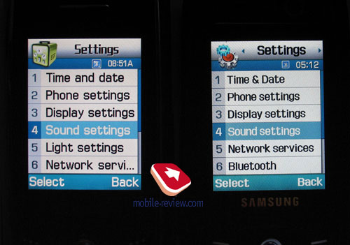 Pictures Editor. It is a simple editor which helps you to make some simple pictures transformation and putting effects. Voice commands (only D800). A system of voice recognition independent of the pronunciation is integrated into the device. It allows both dialing a number from the phonebook and navigation in the menu. Samsung E620 was the first to provide the feature; the function was not applied in local versions of the device. The recognition works with no problems, the system got more stable in exterior conditions, especially at significant noise. Funbox. All the files, such as music, images, videos and sounds are kept here. All the downloaded files are also stored here. One disadvantage here is that sometimes the file is not immediately displayed in the general list and a user has to exit and open the list again. Settings. That is traditional that you are allowed to choose font colour in the standby mode, protect any section of the phone with a password (messages, short messages, organizer and so on). You may set the time for backlighting on and its brightness.