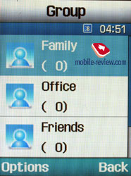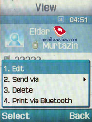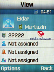There are two fields for a Name and a Surname (search only by the first one) that are concatenated when displayed and the Name field goes the first. For example, if you entered Eldar Murtazin, it is displayed exactly in this manner. The length of each line is 20 symbols for any of the available languages. You may opt to alter the language while inserting the text as well. Files in different languages are sorted out according to a rule - first it will be all files in the local language (Russian, for example), and then those in English. This is rather convenient and habit forming. Taking into account an option of fast language change during the search, it becomes clear that the files in different languages do not impede the work with this phone. Let us return to the information entered for one name. Besides phone numbers, an e-mail address and a little text memo can be recorded. Any music file as well as composed MP3's can be chosen as a ring tone for the name. Three caller groups are preinstalled and out of any category. You can easily create a necessary number of groups, select a personal melody and image for each. D800 does not have any preinstalled groups but all settings are the same. Up to 1000 names with all the data can be saved in the phone's memory. Even if all the available lines are not used, the number of names to be saved would remain a thousand. It is possible to indicate in the settings where the new numbers should be kept by default. There is an option of moving files from the SIM-card although not vice versa. According to the developers, PC is the best means of synchronization, MS Outlook in particular. Any file in the form of SMS/MMS, mail message or other text file can be sent quickly through Bluetooth to another device. There are no problems with sending and the phone book entry being transmitted to another device is precisely decoded without any trouble. New names can be entered only through the main menu; the right soft key always calls for the name list only. You can create your own visit card; its format would be the one of a regular file from the phone book. There can be up to eight numbers in the speed dial list; peculiar is the fact that separate numbers of one name may be in this list as well. The subtitle of the chosen name (but not of the phone type) is displayed on the buttons. When receiving a call, a picture is displayed not on the full screen, but on a part of it, nevertheless having rather large size. Call lists. Up to twenty phone numbers are displayed in each list. There is a combined list of all the last calls with an icon indicating a call type. Tilting the scroll key horizontally, you may switch quickly from one list to another. The date and the time of the call (it's duration is not kept) can be seen for separate files. Similar calls are summed; amount of calls is shown at the opposite from the number. In the detailed view you may see the time of each call. As always, the overall time of the calls and their prices can be viewed in this menu (this service has to be installed).