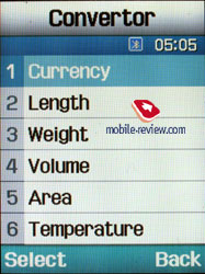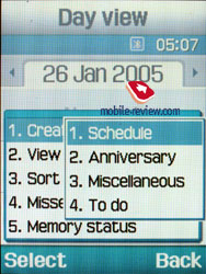 Organizer. Up to 400 events of four types - meeting, affair, anniversary and others, can be saved in the phone's memory. The day and the time as well as its end are indicated for each file. A signal can be set for the interval during which it has to go off; repetitive events are available for setting. The weekly and the monthly calendar are very convenient with each type of the event having its own color.