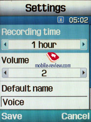 Among some special features sound transfer by Bluetooth to the stereo headphones can be mentioned. This profile appeared in last models by Samsung. The name of the track playing is displayed as well as the overall number of different composition. An equalizer is of an entertaining nature; there are no separate settings. The tracks can be played through the stereo headset as well as through the speakerphone. The volume has ten levels. The user is welcome to create play lists of his/her own. Up to 76 Mb in D800 or flash card and internal memory in D820 can be used for mp3 melodies. Player works in a background mode only at D800; we do not see this option in D820. Dictaphone. You can record up to several hours of voice memos with the number of files being unlimited. The time restrictions for one recording are set by a user and can be one hour in duration. All the files are kept in a separate folder in the memory. The recorder can function well during lectures, conferences and presentations. The phone is a partial substitute for a digital tape recorder.