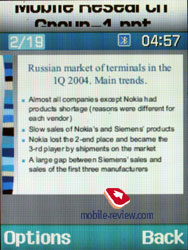 MMS. The interface for multimedia messages is very nice; the messages can be saved in several folders at once and right away. There are no size restrictions for a message to be received although a message should not exceed 295 KB. As for additional services, the rejection of advertising messages, the option of the message receipt in the roaming and the home network should be mentioned. The messages are saved in the general memory since there is no special memory for them.