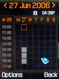 Organizer. There can be up to 400 different events of four types (4x100) - meeting, affair, anniversary and others. The day and the time as well as end time of the even are indicated for each entry. Alert signal, as well as its duration can be adjusted according to your liking; repeatable events are available for setting up (at that repetition time is also adjustable as well as exclusion dates). The weekly and the monthly calendar are very convenient with each type of the event having its own color.