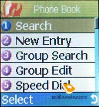 A service LED is located under an external display. It has several colors of backlighting; a user can adjust it himself. A double volume key is positioned on the left-hand side of the phone, a portable handsfree connector and IrDA are placed above it. A system connector, which is covered by a rubber cover, is placed on the bottom of the phone. This rubber cover can’t be removed from the phone; in our opinion it is an advantage of this construction. The phone has also an internal UFB-65K display (128x144 pixels). It contains up to 6 text lines and 2 service lines (title and tips to the soft-keys use). All colors are bright and vivid. Picture quality is very high, it’s obvious, as Samsung has been a leader in this field. Keys are made of plastic, they are rather large and comfortable. Keypad has a blue backlighting and text is not always visible. Now few words about the battery. The phone is equipped with a lithium-ion battery of 900 mAh capacity. According to the manufacturer, the phone could operate 140-360 hours in the standby mode and 2-6 hours in the talking mode. In reality the phone could work about 3 days (in case of 30 minutes of talking, up to 20 minutes of using other features, MTS network). Time of full re-charging is about 2 hours. MenuIn response to functions, E400 is a full copy of S300 except games. So, let us quote a respective review. An access to the menu is get by pressing left soft key. Main menu is made as a list of items, and navigation key or volume key help to move between them. There is also a shortcut number navigation. By the way, you can choose one of two variants of the main menu; they differ in graphics. ![]()