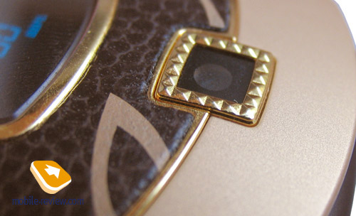 The leather framing is encircled with gold edging; it looks glossy and makes a good impression on the face of it. The same material is used in finishing of the numeric keys; the solution is somewhat similar to that used in Vertu-labeled phones. The navigation pad has much to offer, namely Swarovsky crystals; there are four of them - as many as push directions of the button. Owing to handset’s exterior being painted in brown rather than goldish, the trim of the E500 is a true eye-picker.
