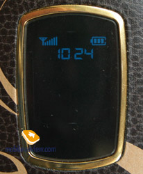 The external display makes use of OLED technology, two lines, which are always on, are lit in blue there. They report on current time, network signal strength and battery status. The remaining part of the display has a resolution of 96õ80 pixels and is capable of showing up to 65K colors. The advantage of the screen is that the picture stays crisp and shard in the sun and doesn’t fade much as against STN- or TFT-powered displays. You can set your wallpaper as a screensaver for the external display, or can choose one of four variants of analog watch.